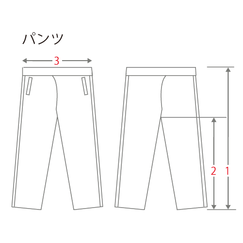- 1.総丈:ウエスト上端~脇の縫い目に沿って裾まで