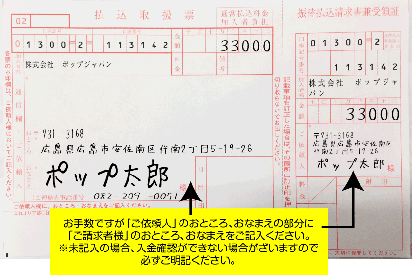 - ・振込用紙は商品と一緒にお送り致します。